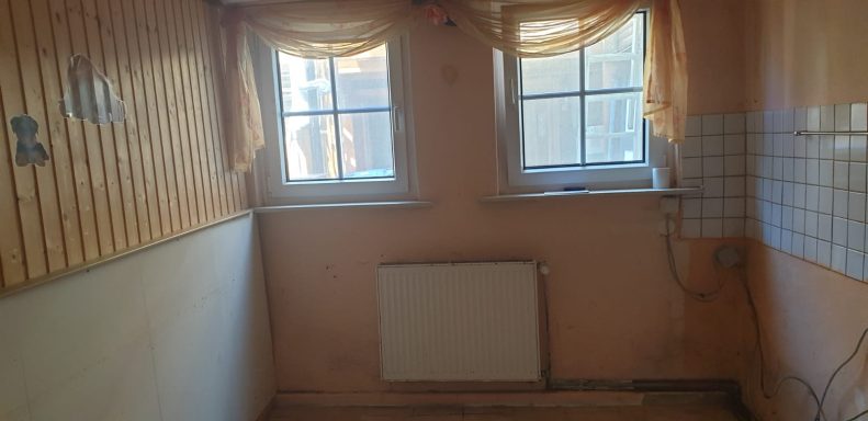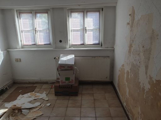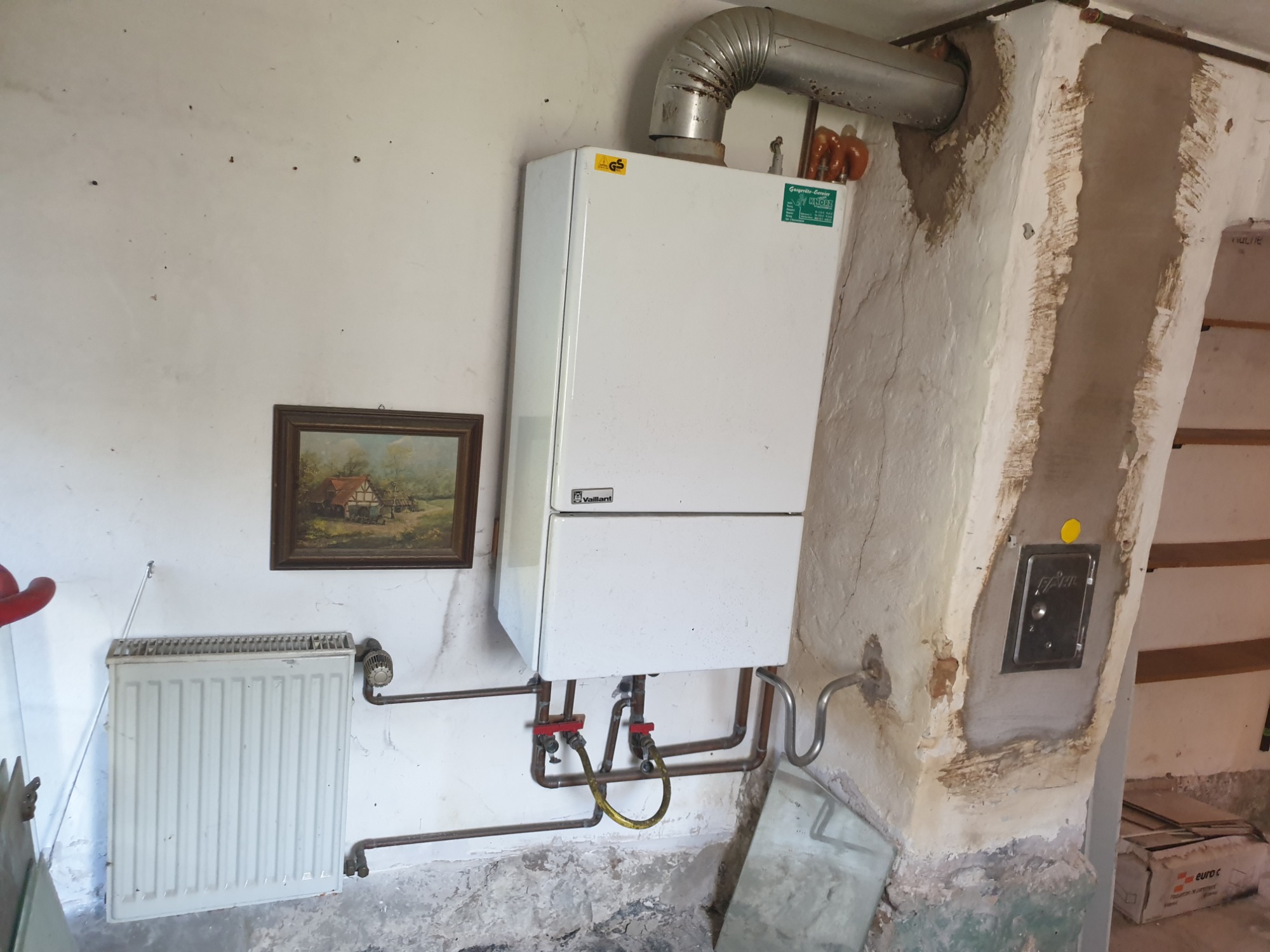 Drei alte Heizkörper, eine veraltete Gastherme, bröckelnder Putz,