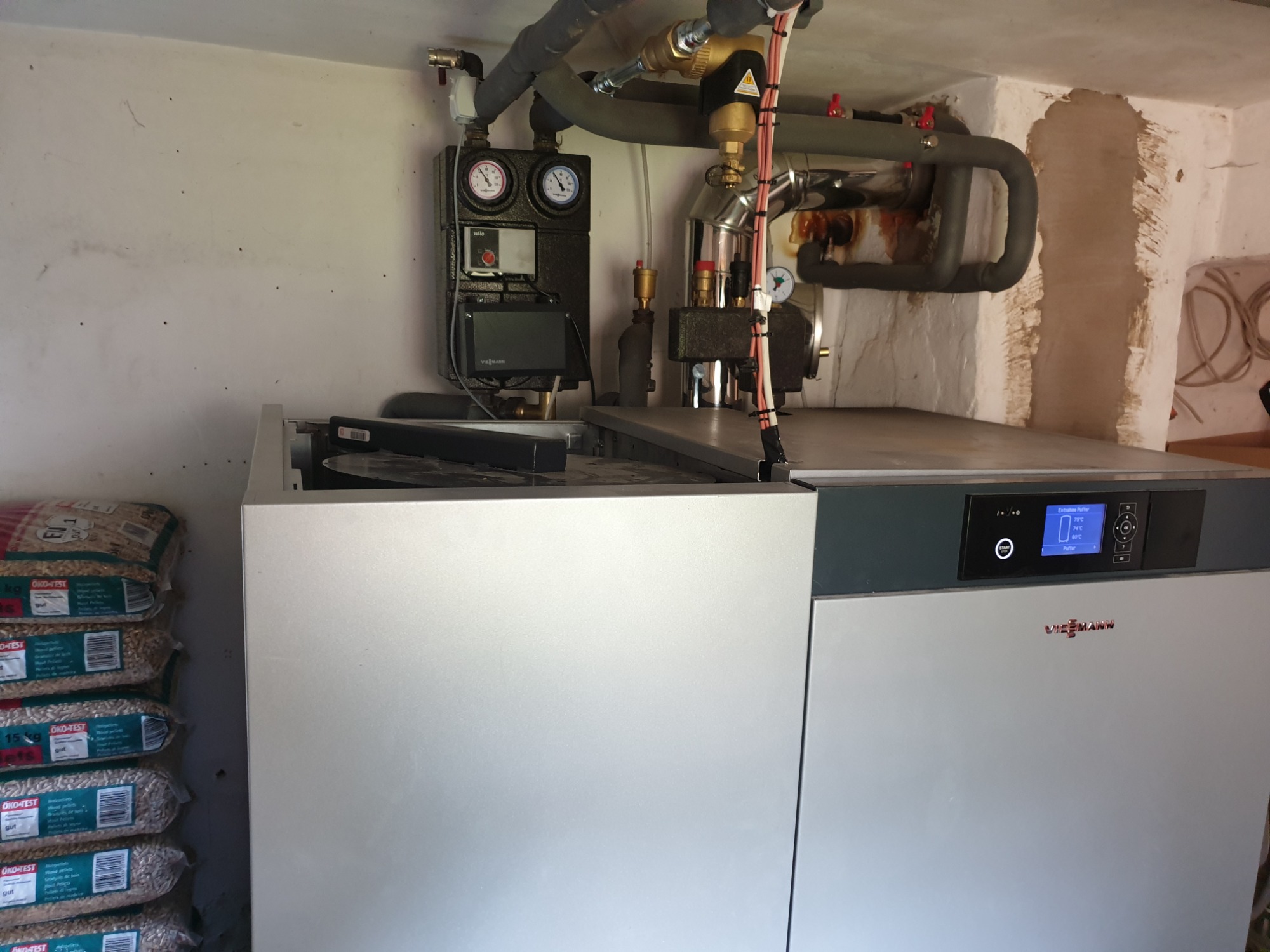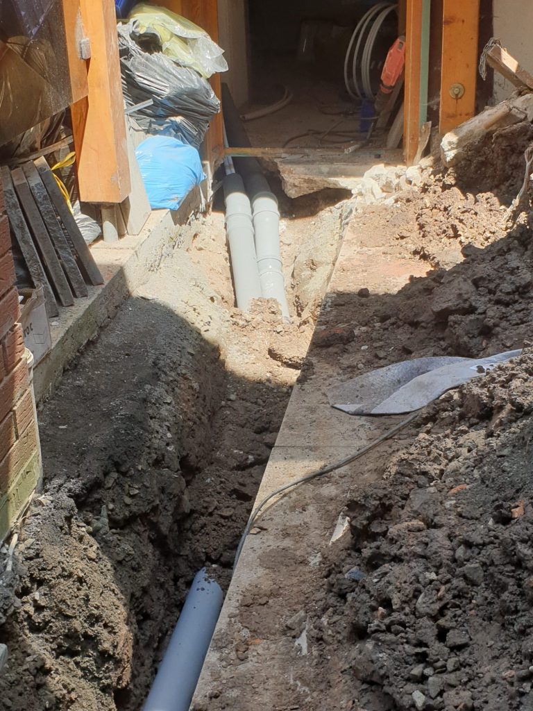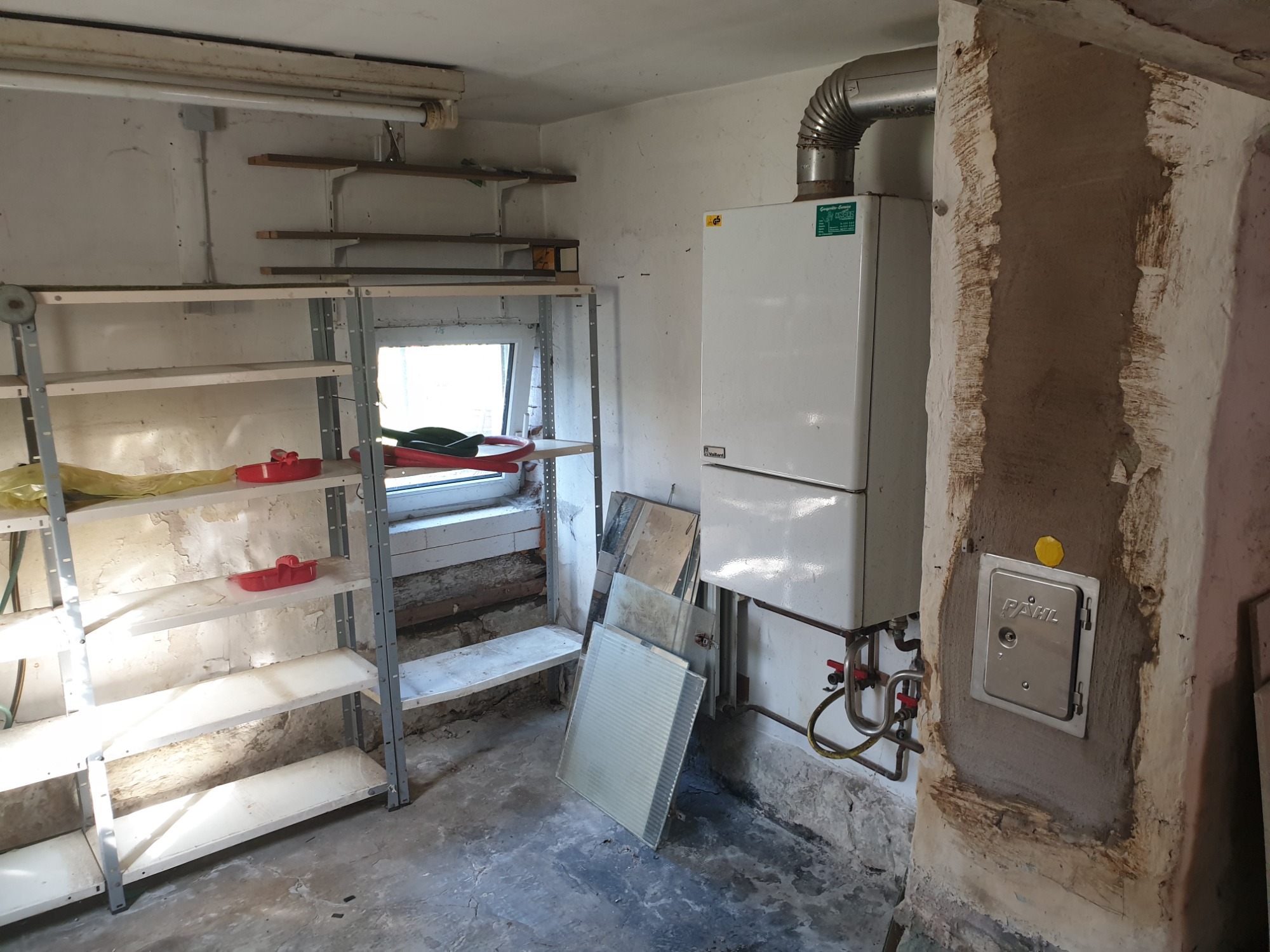 Hier verlege ich neue Leitungen vom Hinterhaus ins Vorderhaus – eine zentrale Heizlösung für beide Wohneinheiten.