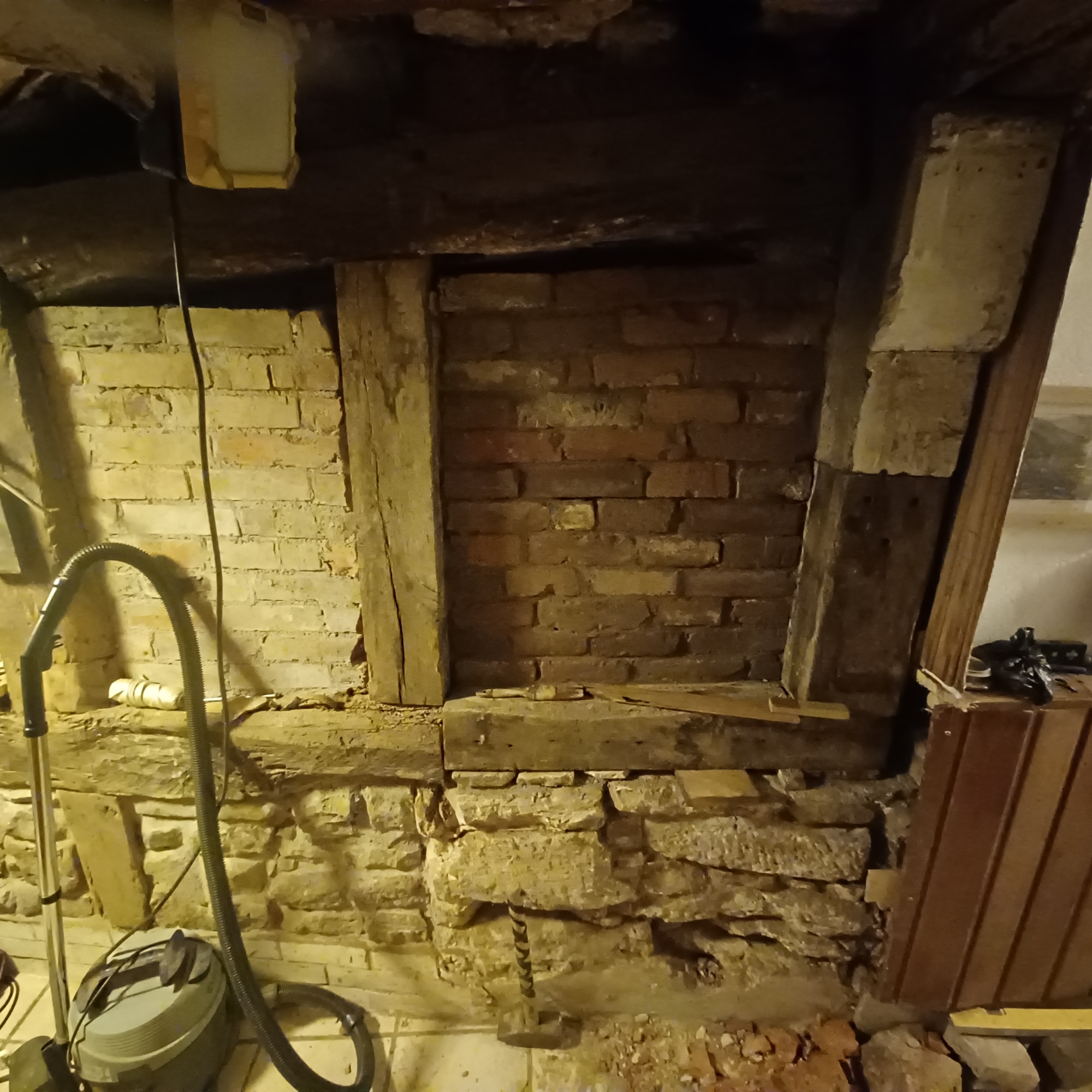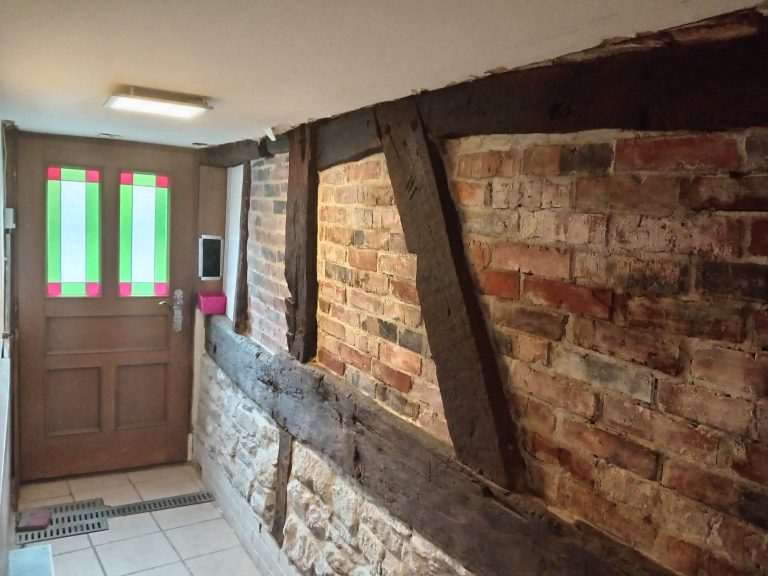 Im Eingangsflur habe ich das gesamte Fachwerk freigelegt, geschädigte Hölzer ersetzt und erstmals eine eigene Balkenprothese eingesetzt.